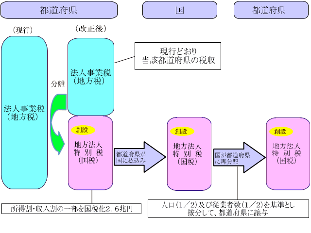 | ・地方法人特別税の税収は、国より都道府県に地方法人特別譲与税として譲与します。 ・譲与基準は、人口(1/2)及び従業者数(1/2)です。 |