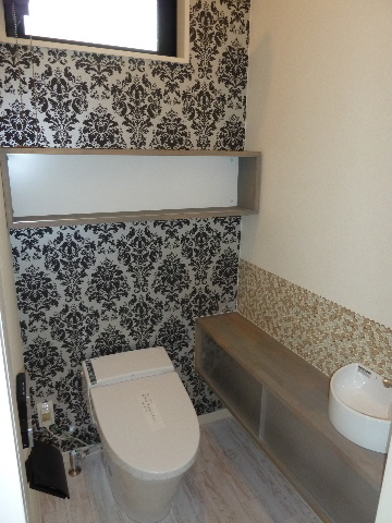 | 1階のトイレです。中央の棚がデザインアクセントになっています。 |
